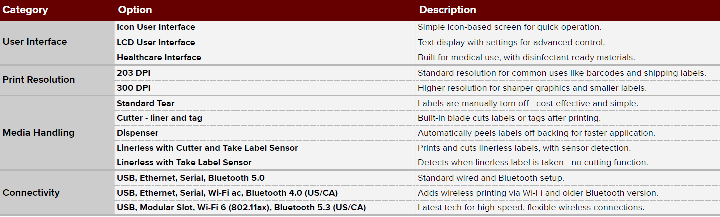 ZD621 Thermal Transfer - HealthcarePrinter Feature Comparison Table:
